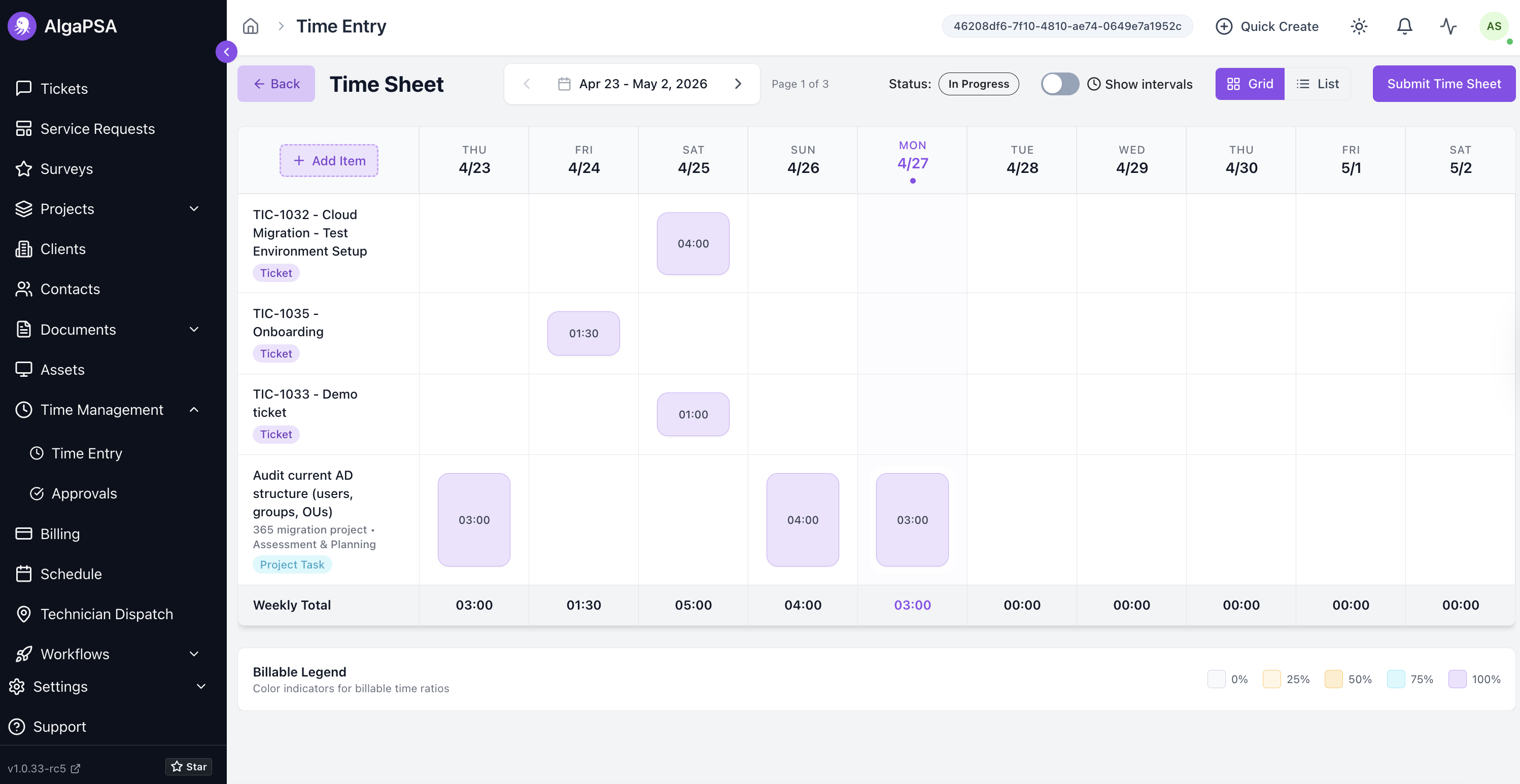 Billable time is often lost due to manual timers, forgotten entries, and inconsistent processes. Alga PSA’s unified ticketing, scheduling, project management, and auto-tracked work entries ensure every minute is captured the moment work begins.